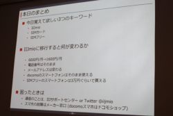 何となく「SIM」などのキーワードを聞いたことがある人に向けた内容で、「IIJmio」「SIMカード」「SIMフリー」の3つのキーワードに絞って解説が行われるとともに、「みおふぉんでスマホ代を安くする」と題し、NTTドコモ利用者がIIJmioに乗り換える場合を想定した料金比較および実際の乗り換え方法が紹介された。IIJmioの契約手続きに加え、アプリによってはアカウント引き継ぎのために「機種変」が必要となる点など細かなポイントもおさえられた。