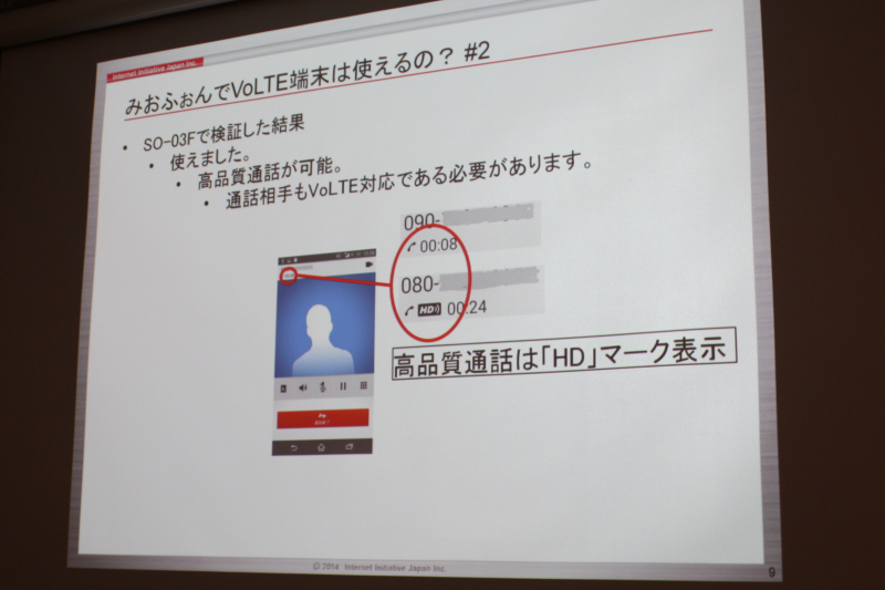 続いて登壇した宮本氏は「VoLTE端末への対応」に関する説明を行った。結論から言うと、IIJmioの音声通話対応SIM「みおふぉん」をVoLTE対応スマホにさすことで、問題なくVoLTEで高品質通話が可能であることが明らかになった。