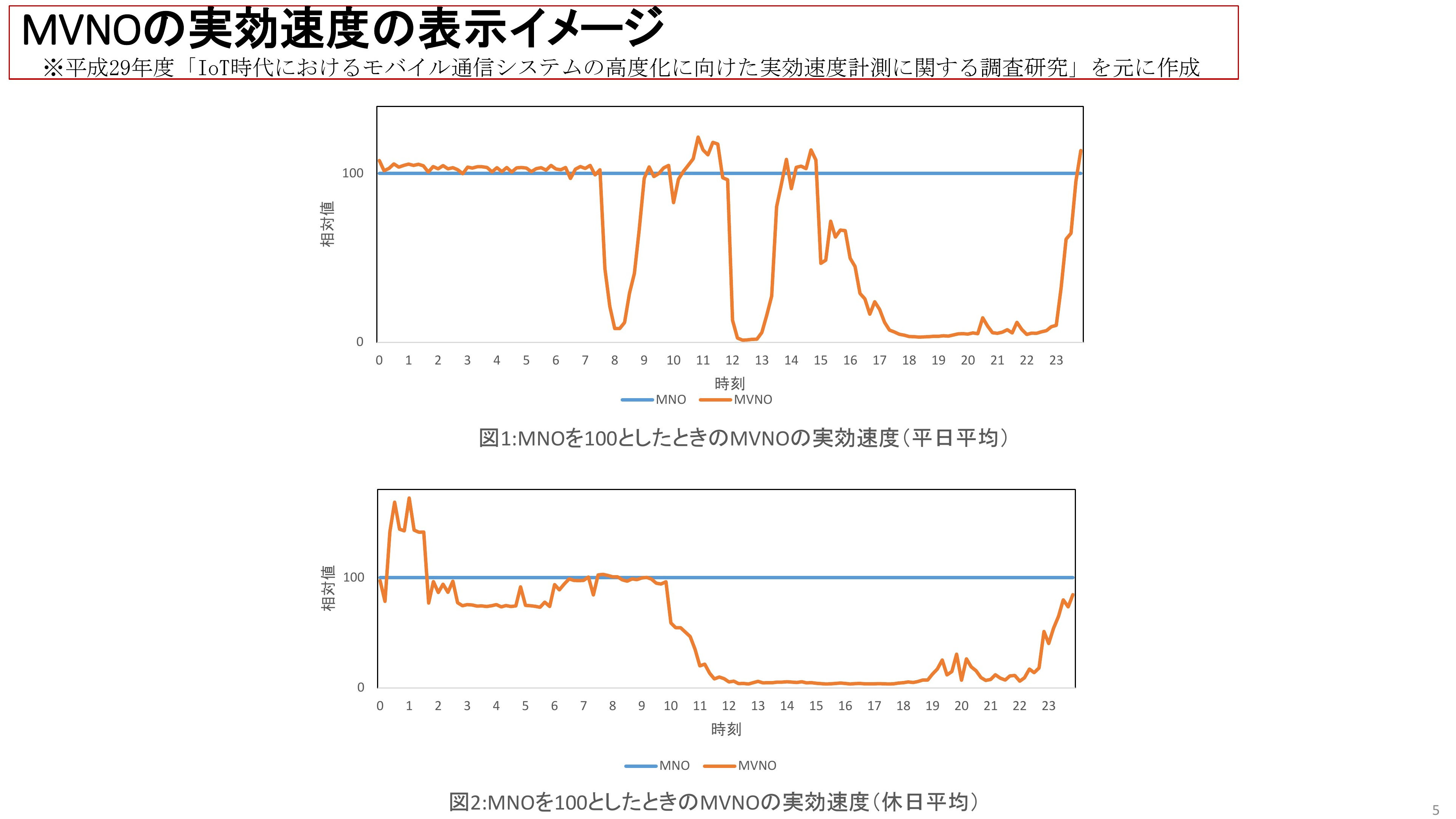 資料では、MVNOの実効速度の表示イメージとして折れ線グラフも掲示された。実証実験をもとに作られたものだが、MNOの速度を100としたときのMVNOの速度をオレンジ色の折れ線で示しており、時間帯によって速度が変化していることが一目で分かるようになっている。実際に開示がはじまれば、消費者が自らのニーズにあったサービスを選ぶ参考に大きく寄与しそうだ。